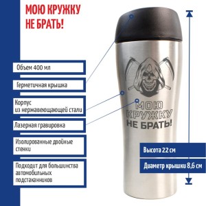 Подарочная термо кружка с надписью станет отличным спутником в машине (для автомобиля), дома или офисе. Актуально как оригинальный подарок с нанесенным логотипом от коллектива, либо в качестве сюрприза с принтом для друзей, а также на праздники близких людей.