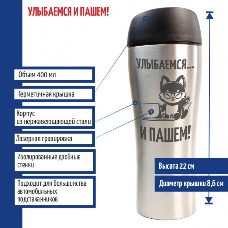 Гравировка нанесена с одной стороны металлической термокружки.