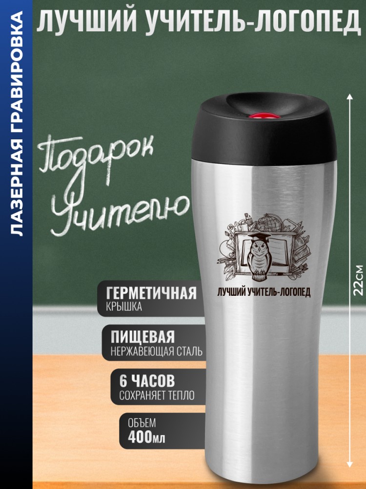 Гравировка нанесена с одной стороны металлической термокружки.
