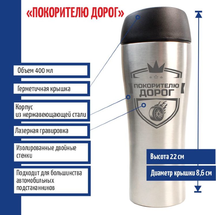 Подарочная термо кружка с надписью станет отличным спутником в машине (для автомобиля), дома или офисе. Актуально как оригинальный подарок с нанесенным логотипом от коллектива, либо в качестве сюрприза с принтом для друзей, а также на праздники близких людей.
