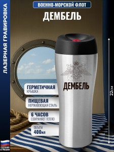 Гравировка нанесена с одной стороны металлической термокружки.