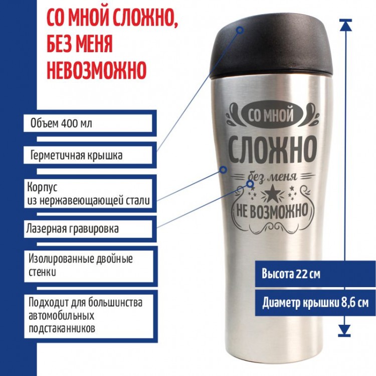Подарочная термо кружка с надписью станет отличным спутником в машине (для автомобиля), дома или офисе. Актуально как оригинальный подарок с нанесенным логотипом от коллектива, либо в качестве сюрприза с принтом для друзей, а также на праздники близких людей.