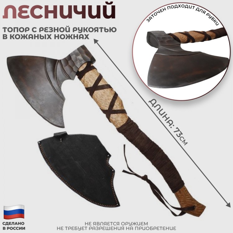 Мастерски изготовленный топор с резной рукоятью и кожаными ножнами, выполненный из стали 65Г, подчеркнет мужественность и станет незаменимым помощником на природе.