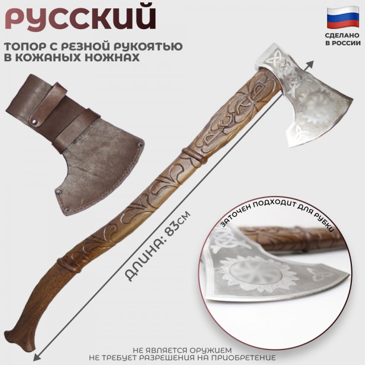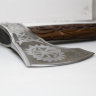 Топоры ручной работы отличаются красотой и высокими эстетическими свойствами, однако они могут выполнять и основную функцию - рубку. Представленный топор изготовлен вручную, он прочен, надёжен и отличается хорошим качеством. Кованая сталь топорища может быть покрыта рисунком, резная рукоять с узорами и орнаментами служит украшением, привлекает внимание. Топорики относятся к хозяйственно-бытовой категории, поэтому для их покупки не требуется сертификата. Подарочный топор - это оригинальный и интересный сувенир, который пригодится и в хозяйстве.