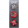 Значки прикреплены к картонной подложке и упакованы в блистер.