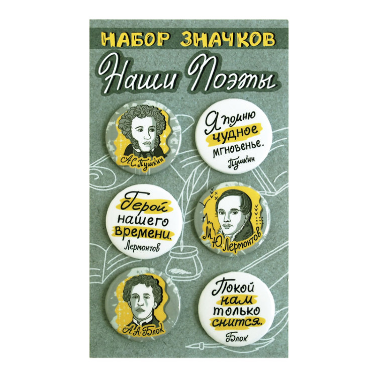 Литературный набор - дань уважения великим поэтам. Шесть значков для истинных ценителей искусства.